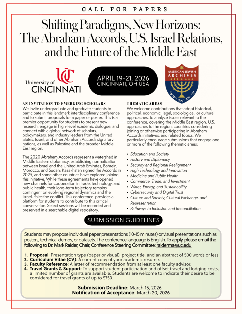 Papers selected will be presented at the conference hosted by the University of Cincinnati and the American Jewish Archives. Select sessions will be recorded and archived in a searchable digital repository. Selected papers may thereafter be considered for inclusion in an edited volume or special journal issue (12–15 papers). The conference language is English.