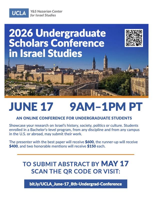 The UCLA Y&S Nazarian Center for Israel Studies will be hosting its online 8th Annual Undergraduate Scholars Conference in Israel Studies on Wednesday, June 17th, 2026, from 9:00 AM to 1:00 PM, Pacific Time. The conference is an excellent opportunity for undergraduate students from any university in the United States and abroad to present their research on any aspect of modern Israel.